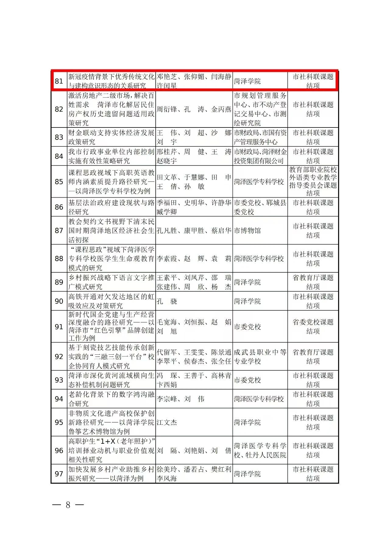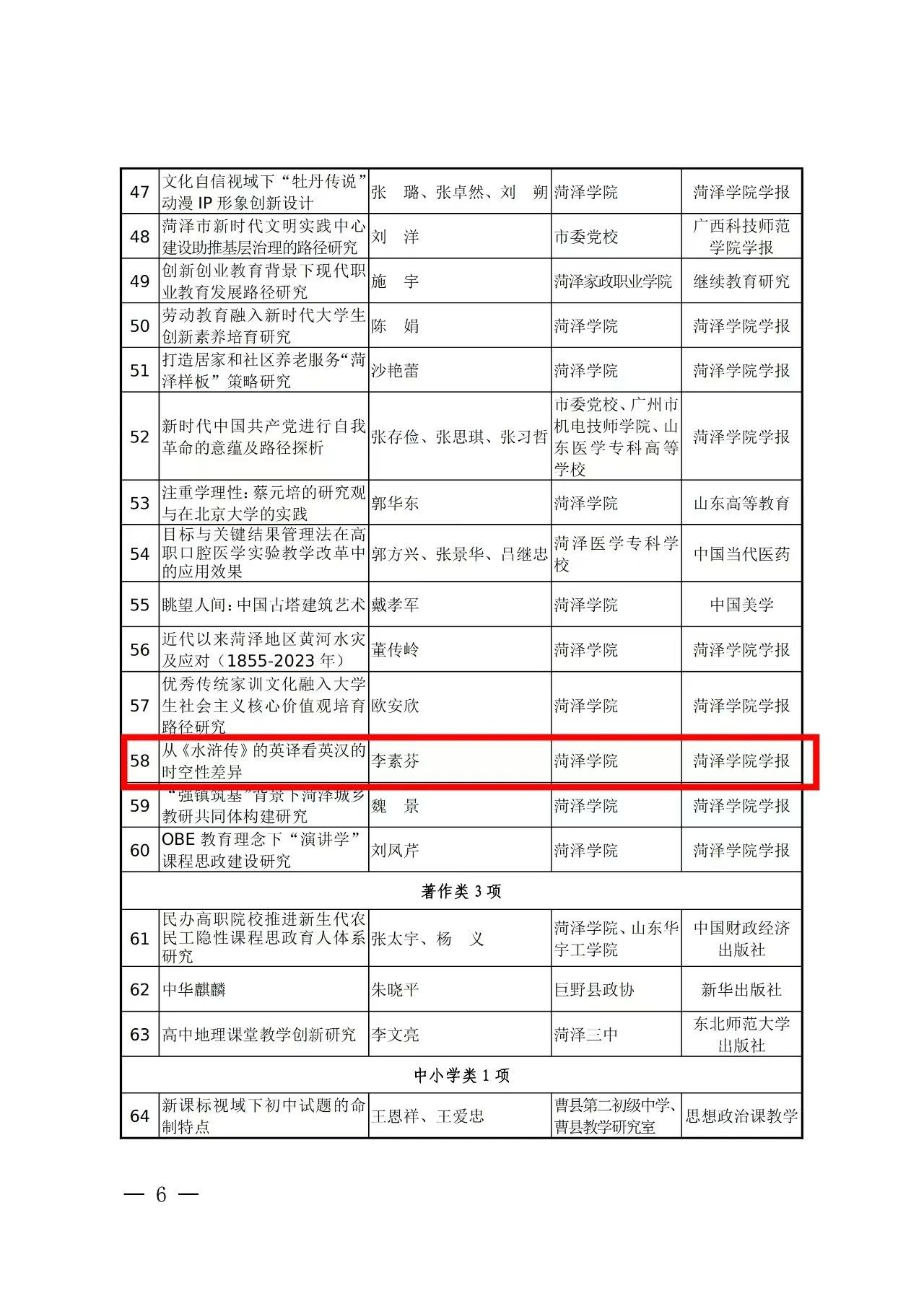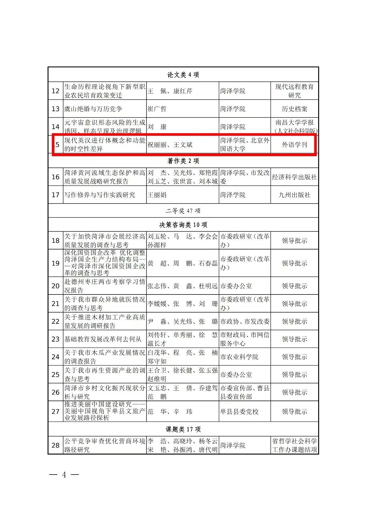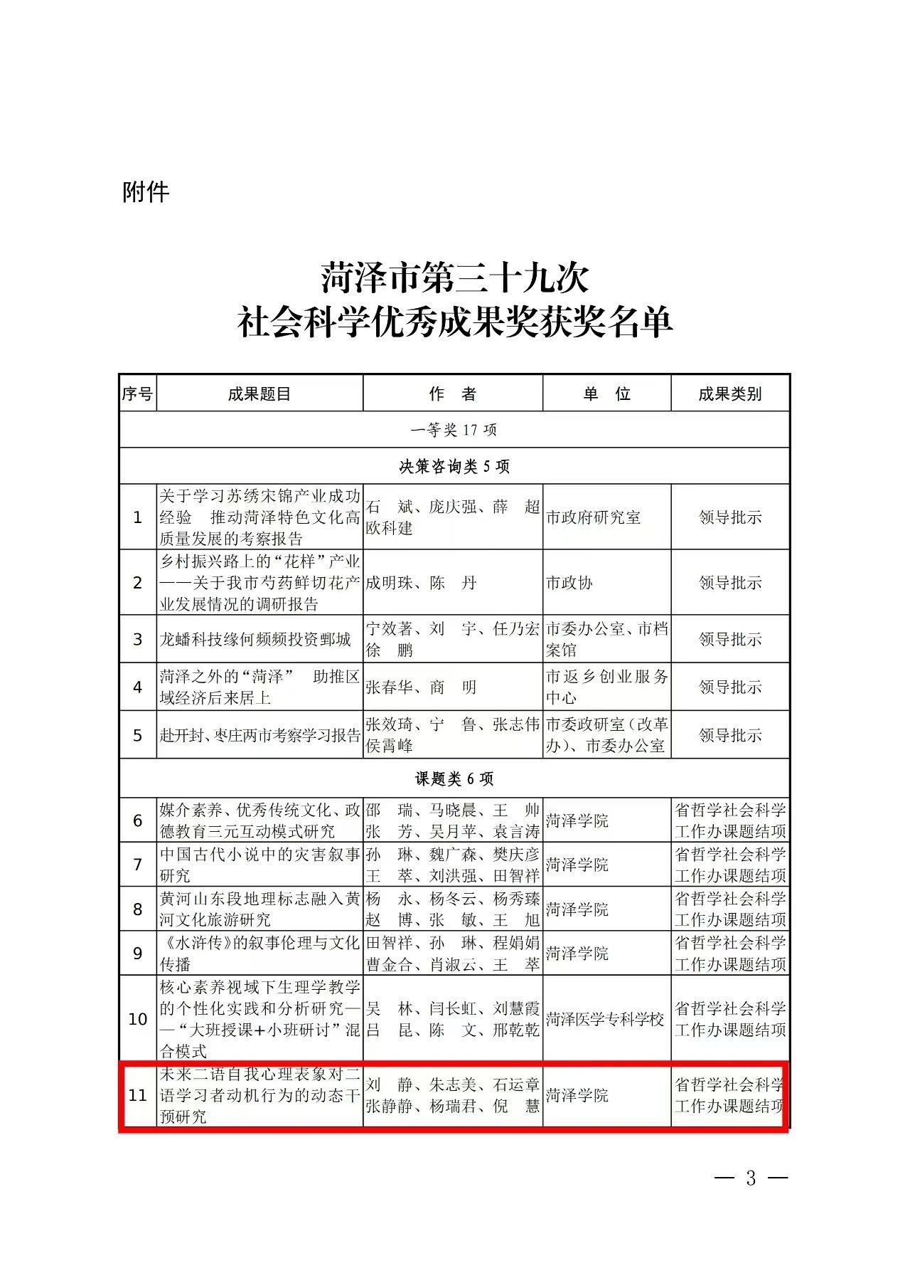 2024年11月12日,菏泽市第三十九次社会科学优秀成果奖结束评选工作。我院教师在此次评奖活动中取得了优异成绩,共获4项奖项,其中一等奖2项、二等奖1项、三等奖1项。这是既我院教师荣获2项2024年度菏泽市软科学优秀成果奖之后再创佳绩。