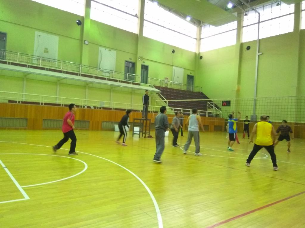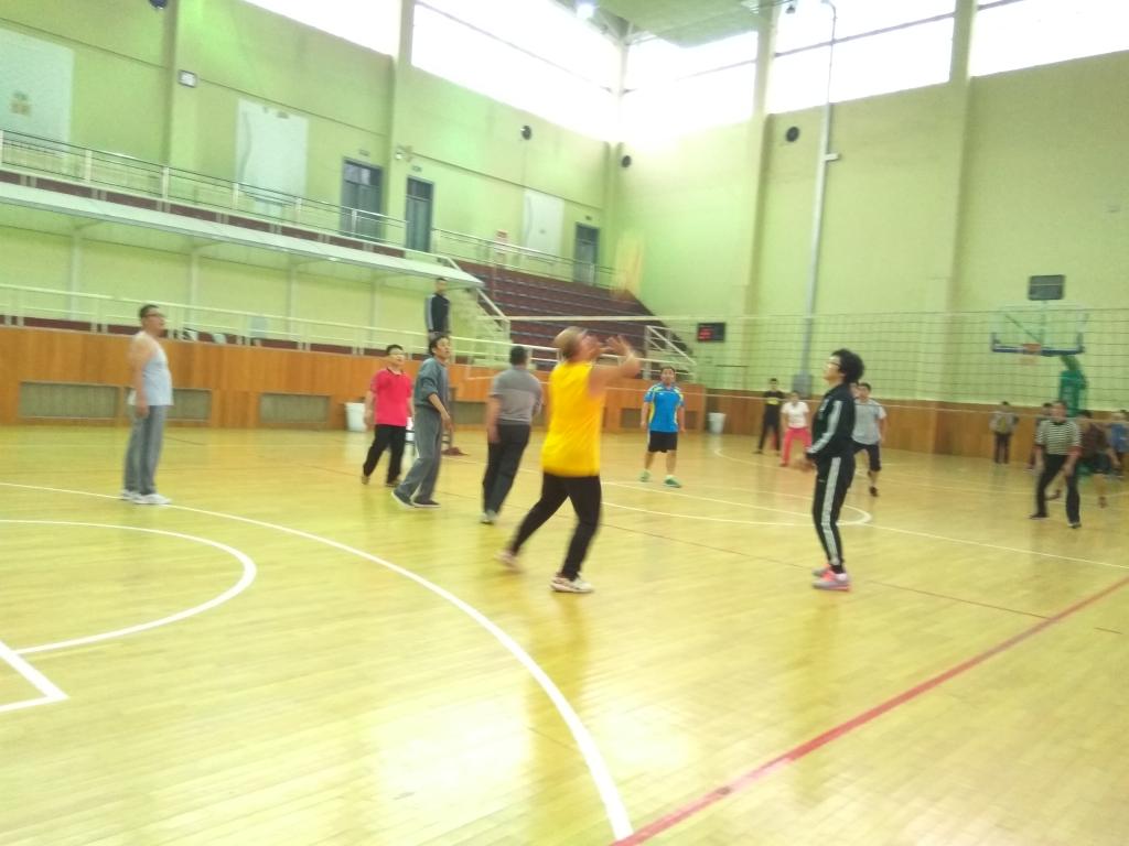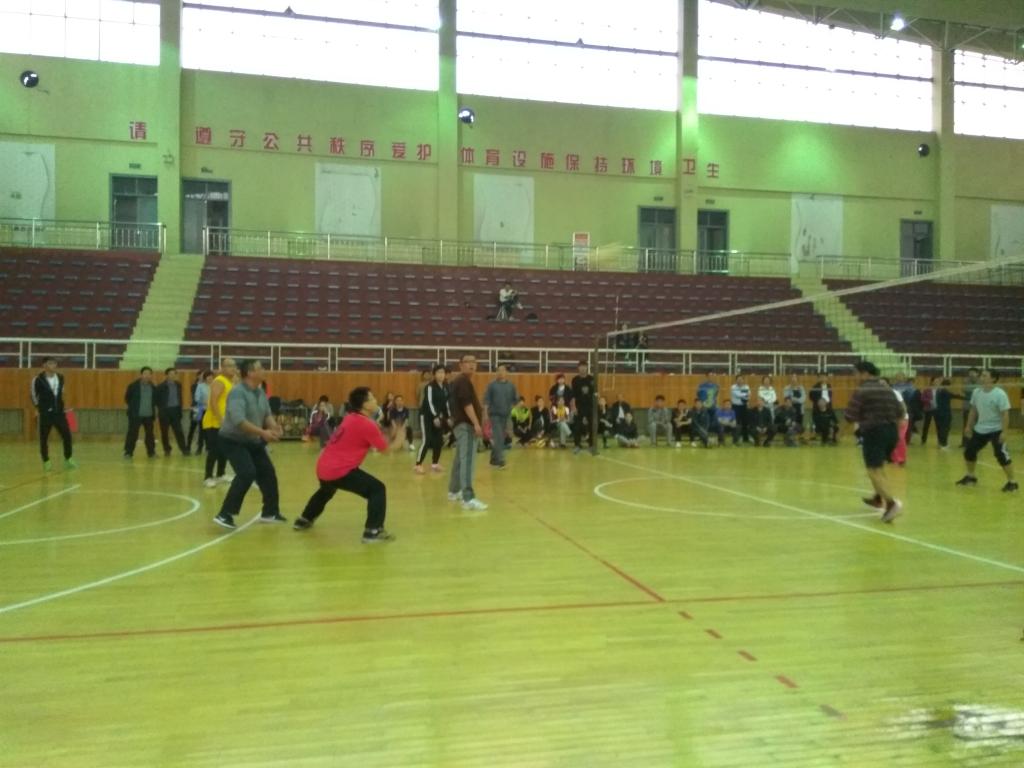 上半场一开始,两方队员便各施绝技,开始激烈的角逐。我系孔凡生老师高吊发球,并拦死对方的进攻球、短平快球,逐渐扩大比分差距,现场惊呼一片,喝彩声不绝。体育系也毫不示弱,坚守阵地,火力全开。随着啦啦队员的不断呐喊加油声,比赛愈演愈烈,我系老师为赢得比分,阻挡对手进攻,甚至侧身扑地,双手使劲上伸,将快要落地的球重新抛向空中,刘静老师辅以后攻,灵活吊球推空当,连连得分。最终,体育系以微弱优势卫冕,我系老师以出色的表现及雄厚的整体实力在决赛中荣获亚军。