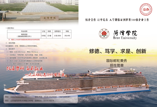 1、专业名称:商务英语(与青岛蓝色经济教育集团校企合作)“国际邮轮乘务”方向