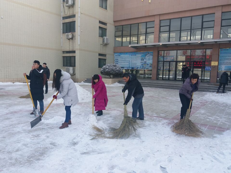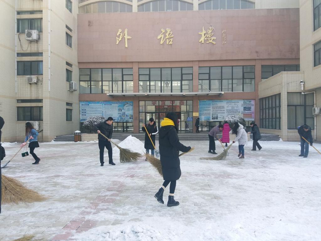上午八点,我院师生在党委副书记刘静的带领下首先对外语楼周围进行了仔细的清扫,确保前来学习的同学们出行通畅、行走安全。随后,我院的学生会主要干部各司其职,李翠霞老师带领李尊顺、王子铨等学生干部对外语楼到伟德victor1946正门通道进行了打扫,苑宪琨、郝海玲、黄永华、孔凡生、杨卫娟五位老师则带领剩余学生干部对我院楼前结冰路面进行了仔细认真的清扫,戴雪薇、赵若雯等我院普通同学也参与其中。众人拾柴火焰高。本次清扫直到上午十点结束,共持续了两个小时,在我院师生的共同努力下,外语楼周围以及主要通道被全部清扫完毕。