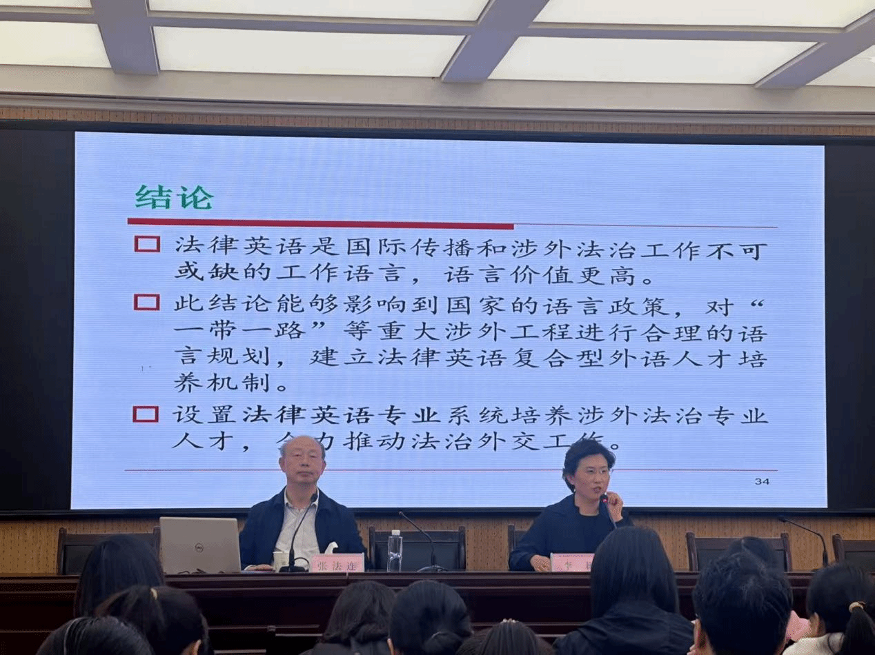 在讲座的结尾部分,张法连教授总结了其核心观点,强调涉外法律语言服务应以法律英语专业人才培养为重要突破口,通过提升法律翻译等能力,讲好中国法治故事,塑造良好的法治中国形象,从而有效推动构建人类命运共同体。