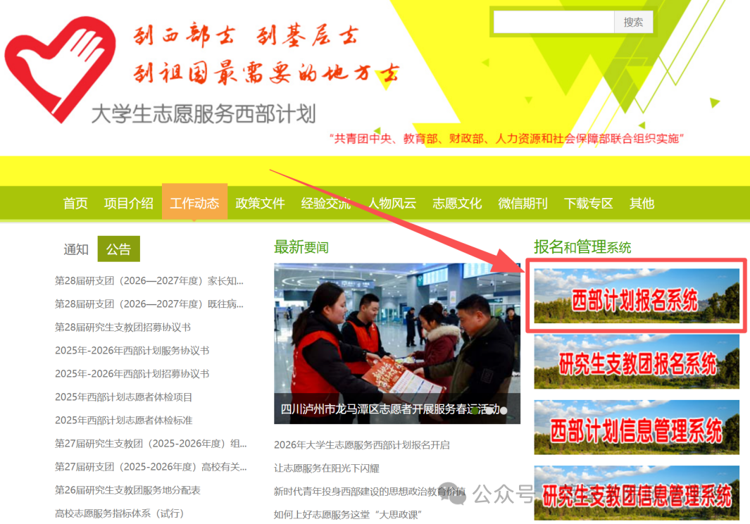 3月1日至5月10日,2026年普通高等学校应届毕业生或在读研究生,可登录西部计划官方网站(https://xibu.youth.cn)或通过“西部志愿汇”微信公众号 (菜单栏中的“我要报名”),在西部计划信息系统(https://west.youth.cn/login)中完成注册报名。