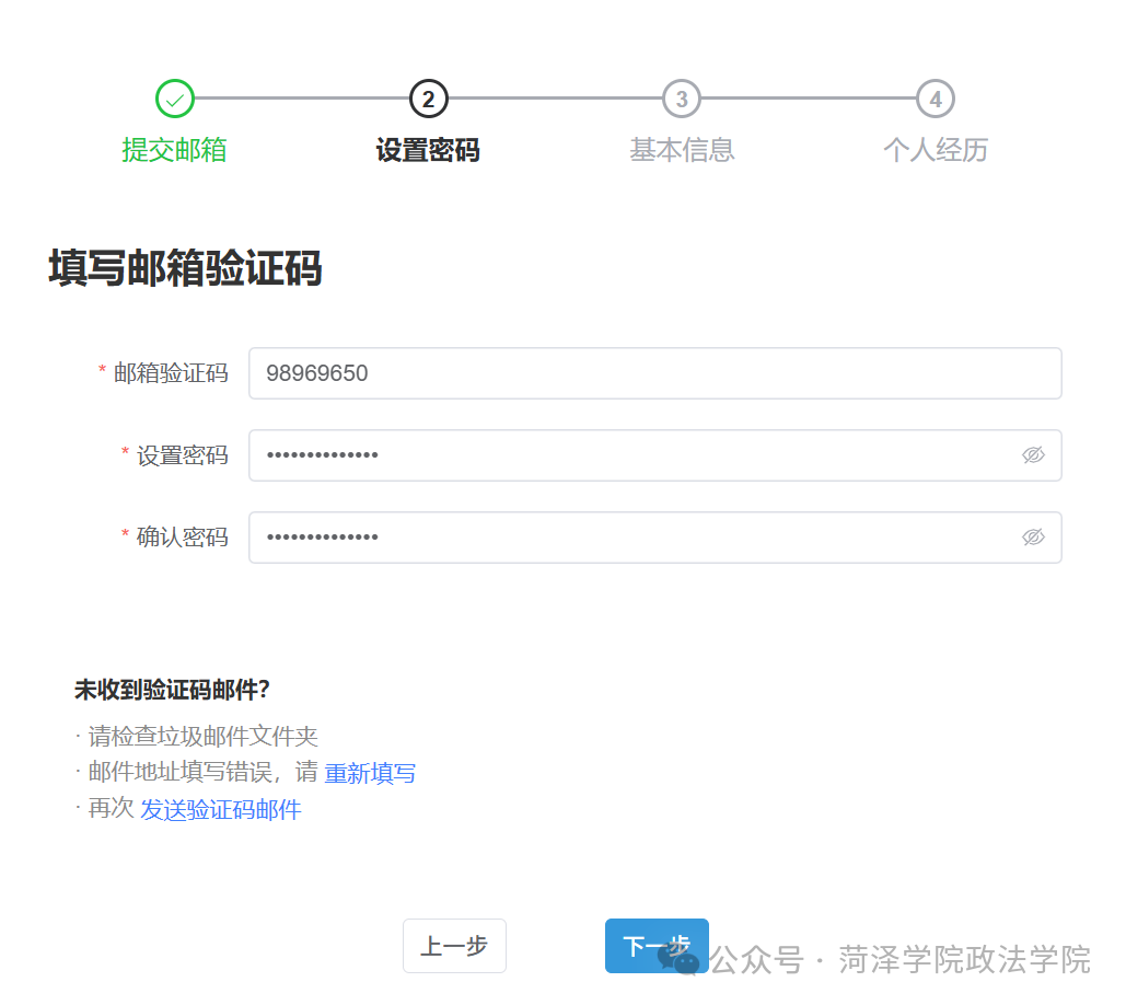 ◆ 输入邮箱验证码及账号密码。(请务必使用常用邮箱,并牢记账号、密码!)