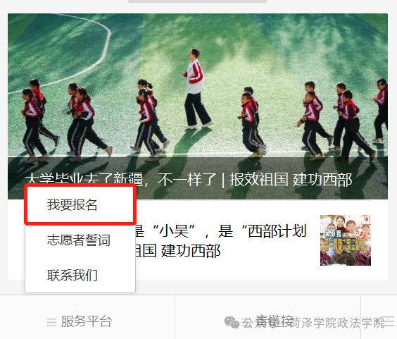 进入“西部志愿汇”微信公众号,点击菜单栏中的“我要报名”,进入西部计划信息系统。