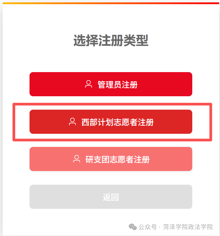 ◆ 选择“注册类型”:西部计划志愿者注册。