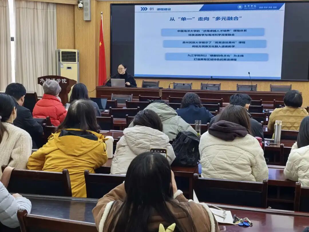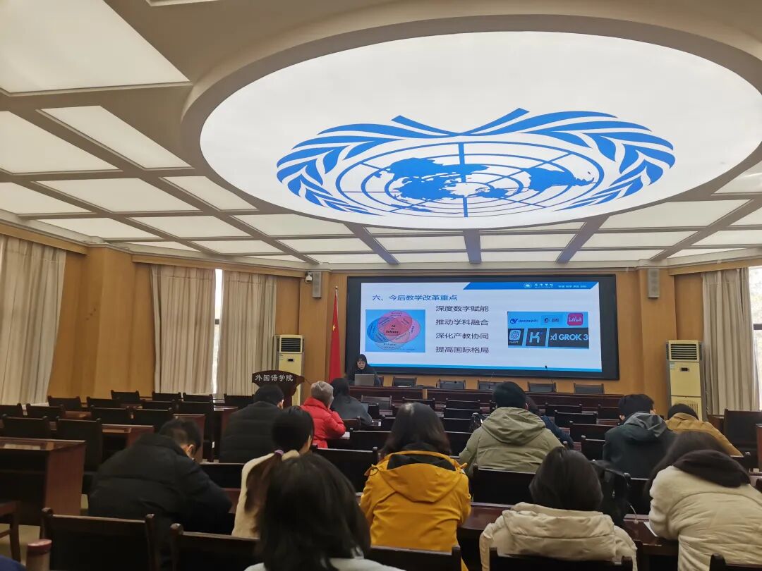 会上,大学外语教学部副主任桑海英分享交流了第十五届全国大学英语院长/系主任高级论坛的会议精神,讲解了当前国内大学英语教学改革的前沿动态与发展趋势。大学外语教学部副主任高艳丽作了题为《推进我校大学英语教学改革的思考与建议》的报告,报告从课程建设、教材选编、技术赋能、教师发展四个方面,系统阐述了大学外语教学的改革路径。大外教研部主任赵龙结合论坛精神,分享了心得体会,提出要以“AI赋能”与“课程思政”为突破口,聚焦教学改革中的关键问题,研究制定大学外语教学部“政绩清单”,推动大学外语教学在守正创新中实现高质量发展。