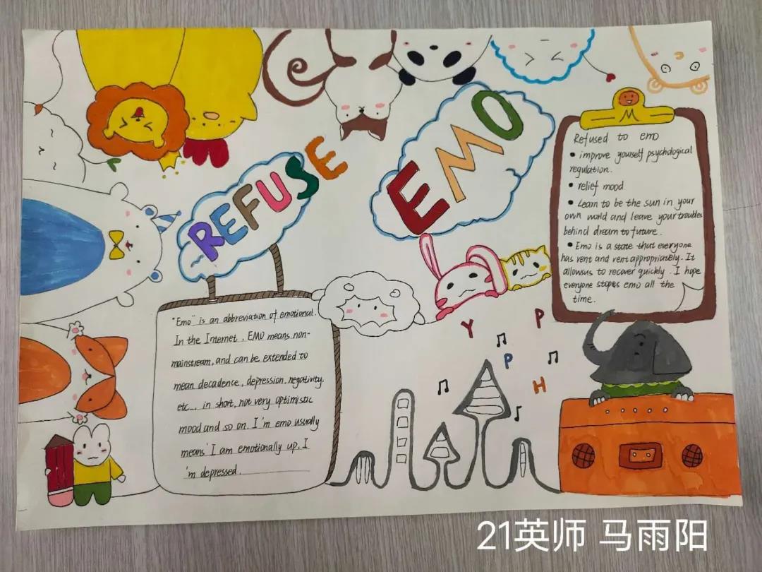 本次活动以手抄报绘画的形式,目的是了解学生的内心想法,帮助学生们拒绝emo,更好的了解自我,接纳自我。选手们的作品内容以对emo的定义,怎样去解决emo所带来的坏情绪以及怎样以积极乐观的心态去面对生活难题为主。评委根据绘画内容、字体书写、排版格式、所宣扬的主题等方面对作品进行一一打分。最终评选出一等奖两名,二等奖三名,三等奖四名,优秀奖十名。