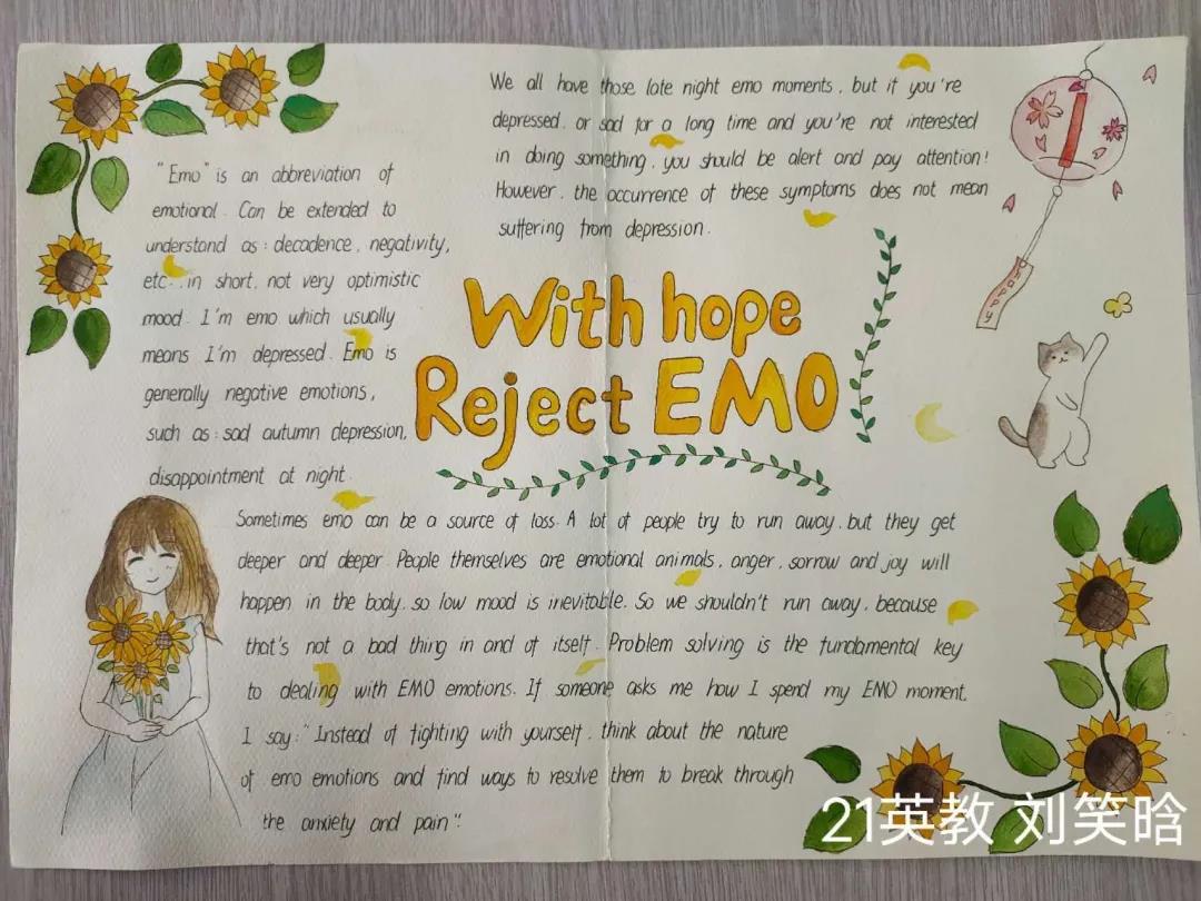 为帮助学生摆脱消极情绪,引导学生积极乐观地面对生活中的难题,争做情绪的主人。由伟德国际victor1946团委主办、伟德国际victor1946学生会心理健康部承办的“满怀希望,拒绝emo”手抄报比赛于12月8日—12日举办。