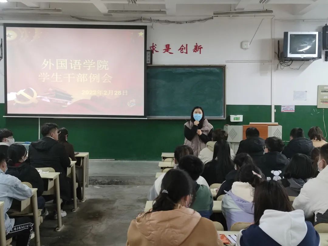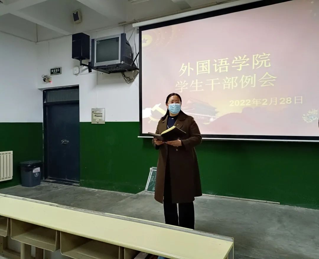 会上,学生会各部负责人汇报了部门学期工作计划。张丽竞对学生会新学期工作进行了安排部署,在安全、学习、卫生等方面提出具体要求。辅导员对所负责的主要工作进行具体安排。刘艳丽向学生干部对我院2021年学生工作和班级工作的辛勤付出表示感谢。刘艳丽传达了校学生工作会议精神,并围绕做好疫情防控工作、加强学习、强化学生日常管理、打造学工活动品牌、加强学生干部教育等方面提出建议。她希望学工队伍强化责任意识、树立全局观念和大局意识、开拓创新并高效工作、凝聚力量、团结协作、勤奋学习、积极思考、扎实工作,确保我院2022年学生工作再上新台阶。