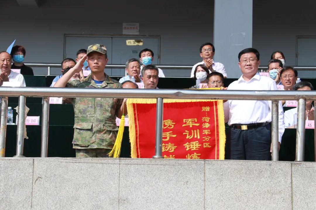 汇演结束后,副校长胡尊东同志宣读 2022 级新生军训工作先进集体和先进个人表彰决定。我院荣获“军训工作先进单位”“军训工作先进连队”荣誉称号;李玉忠、曹展展老师获得“军训工作优秀指导教师”;我院王媛媛等八名学生荣获“军训优秀学员”荣誉称号。最后,学校党委书记衣玉琛同志代表学校向菏泽军分区赠送锦旗,他代表全校师生对全体新生的到来表示热烈欢迎,向大家圆满完成军训任务表示衷心祝贺,向军训教官表示诚挚感谢。他提到,希望学生在未来学习生活中继续保持军训中树立的严明纪律、发扬军训中养成的优良作风、增强军训中凝聚的集体意识,拼搏出属于自己人生的精彩。