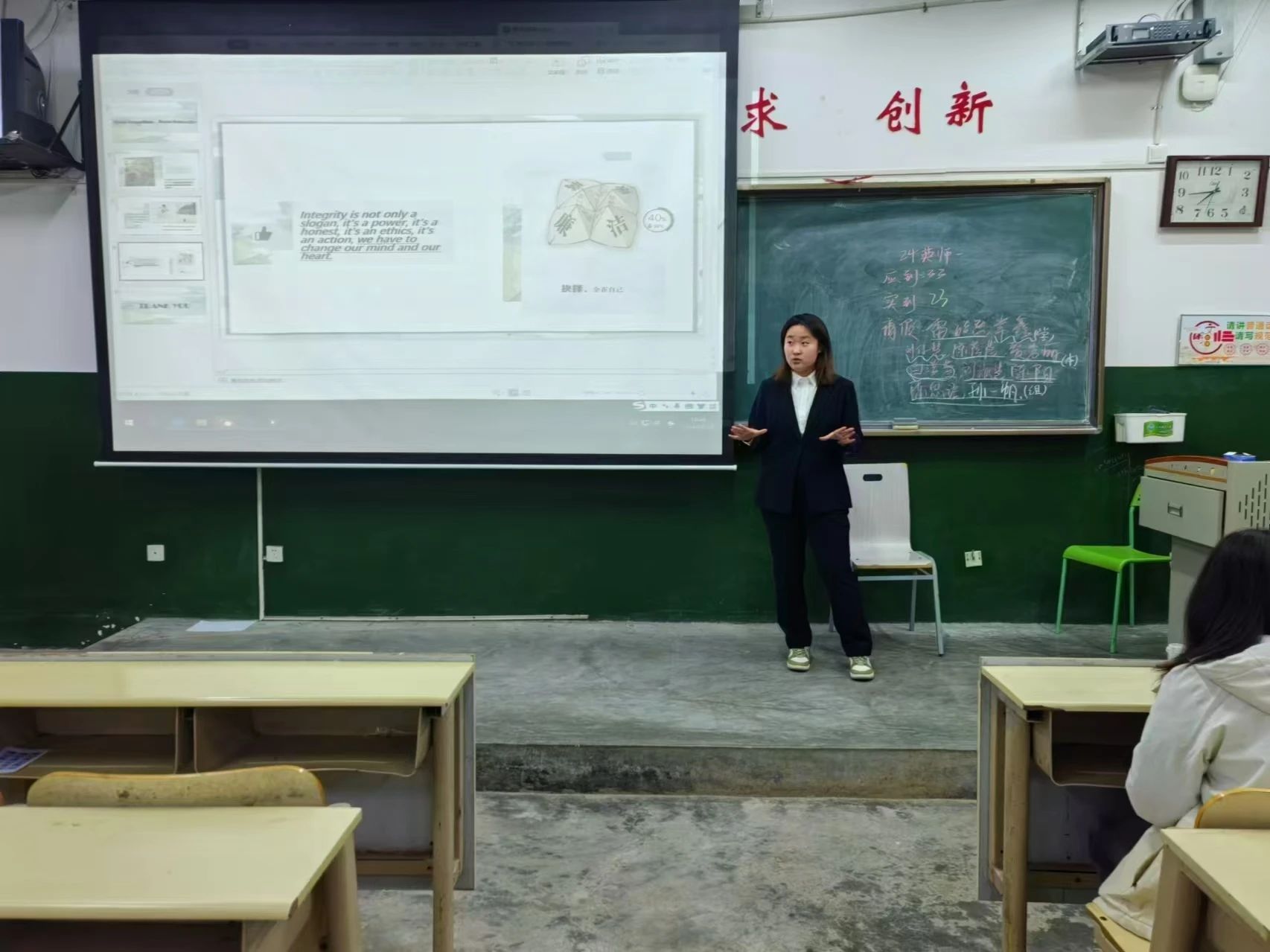 在比赛期间,学生们自信且从容地以流利的英语口语,生动地表达出自己对于廉洁的深刻理解,同时还阐述了各自所熟知的廉洁故事。2023 级商务英语专科二班的陈润雨同学,其作品旁征博引、构思精巧,给评委们留下了极为深刻的印象,成功在众多参赛者中脱颖而出,拔得头筹。2023 级商务英语专科一班的徐天天同学,其作品则巧妙地利用生动的视频向大家展示了何为廉洁,并且结合贴合廉洁主题的图片,极大地增强了作品的说服力。评委们综合各方面因素进行考量,最终评选出了一等奖、二等奖、三等奖。