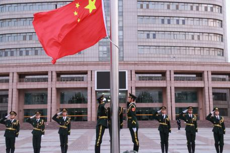 6点45分,升旗仪式正式开始。国旗护卫队队员迈着整齐有力的步伐,护卫着国旗走向升旗台。气势磅礴、振奋人心的国歌奏响,鲜艳的红星红旗在晨风中冉冉升起,师生们行注目礼,高唱国歌。