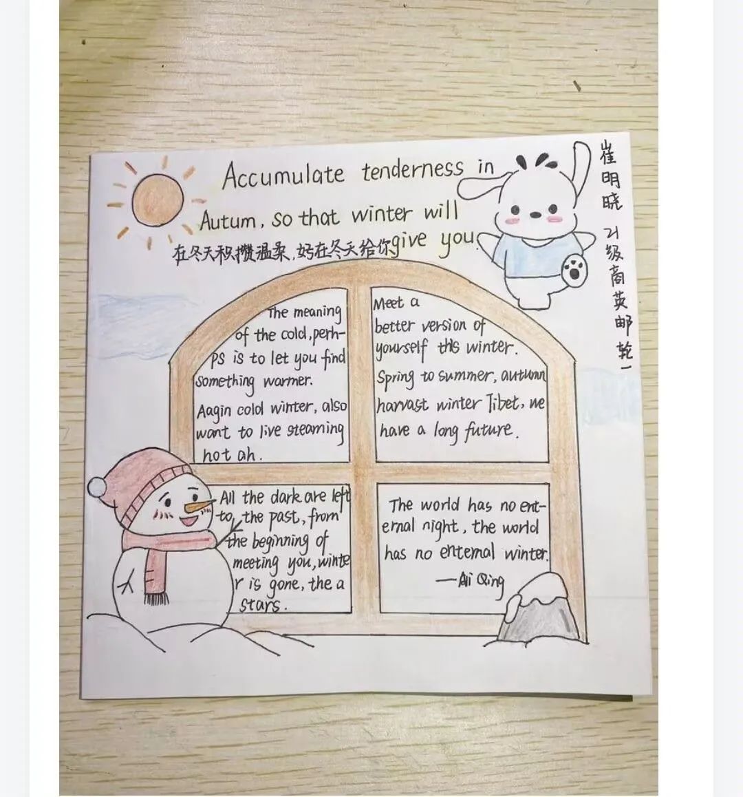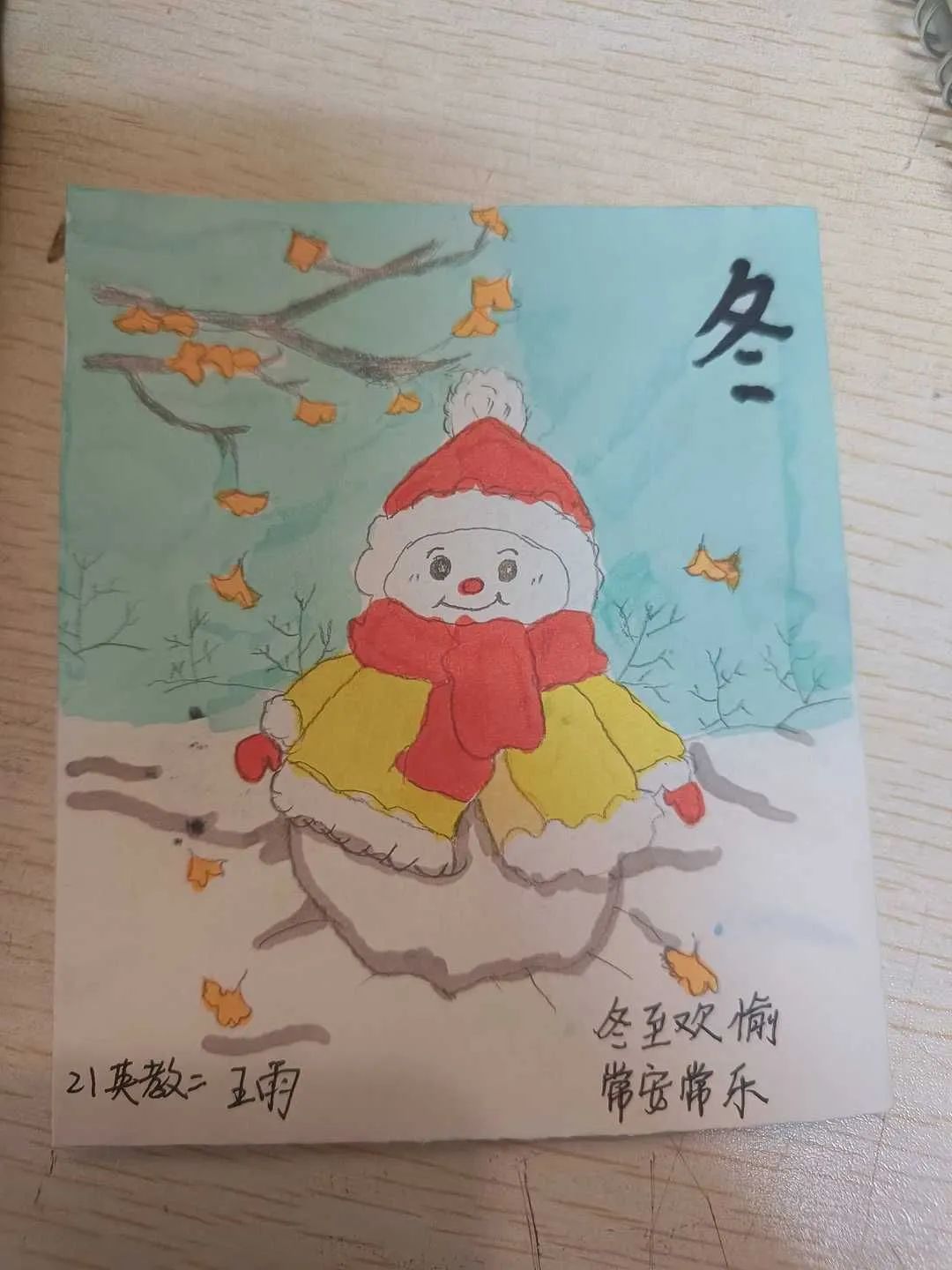 此次活动参赛选手通过绘画和文字来设计卡片,展现自己眼中的初冬景色。2021级小学英语教育二班王子宁制作立体卡片,加以鲜花作为点缀,别有趣味,获得评委的一致好评。2021级小学英语教育二班王雨则选取具有代表性的雪人、落叶,用丰富的色彩和纹理,营造出温暖的、祥和的气息。评委根据选手作品的内容、设计及字体美观程度等方面进行综合评价。最后评选出一等奖、二等奖、三等奖。