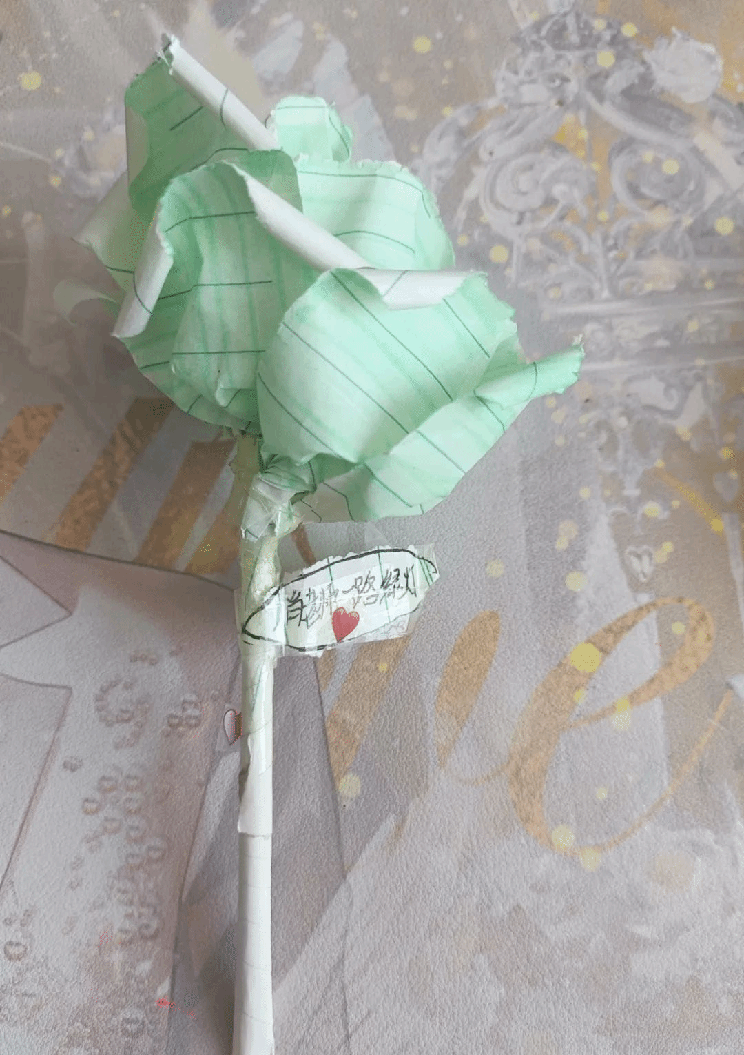实习日子里,收到学生亲手做的纸花,那一刻,惊喜与感动瞬间涌上心头。看着用作业本纸折成的绿玫瑰,还有 “肖老师一路绿灯” 的祝福,眼眶忍不住发热。它让我知道,课堂上的倾囊相授、课后的耐心答疑,都被学生记在心里,化作这朵永不凋谢的纸花。原来教育的意义,就是这样双向奔赴——我点亮知识的灯,他们以真心为礼,照亮我实习支教的旅程,让这段经历满是温暖与力量。