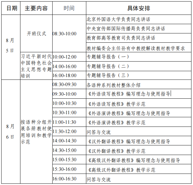 伟德国际victor194623名参训教师参加了英语、日语、俄语和德语四个语种培训,培训课程包括相应语种《外语读写教程》、《汉外翻译教程》和《高级汉外翻译教程》的编写理念、使用指导及教学示范。培训由中宣部和教育部主办,北京外国语大学、外语教学与研究出版社、全国高校教师网络培训中心具体组织,授课讲师都是来自北京外国语大学、上海外国语大学、复旦大学等教材编写单位的知名教授和博士生导师。具体培训日程安排如下: