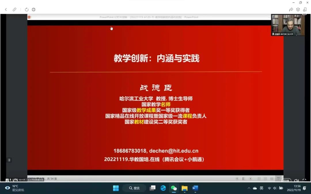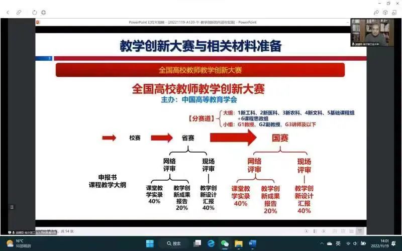 2022年11月19-20日,伟德国际victor1946组织教师集体参加了为期两天的“备战第三届全国高校教师教学创新大赛暨教学创新与参赛经验分享”线上研修会。本次线上培训特邀第二届全国高校教师教学创新大赛中荣获一等奖的三位教授做经验分享。获奖团队主要从课程定位、课程建设发展问题、教学内容重构、教学设计重塑、教学资源建设及评价体系构建等方面的提升和创新过程及经验进行了分享;评审专家则结合自己多年教学经验以及多次参与教师创新大赛评审与指导工作的经验对教学创新的内涵进行了深度解读。