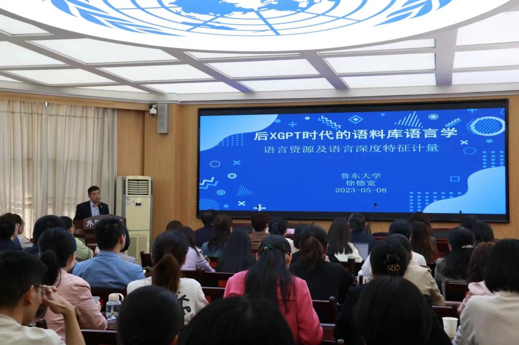徐德宽教授的讲座题目为“后XGPT时代的语料库语言学--语言资源及语言深度特征计量”。徐教授从CHATGPT的冲击入手,首先对深度语言特征计量系统的三个模块——语言资源模块、语言信息深度处理模块、深度语言特征自动计量模块进行了详细解读,接着对描述统计、推断统计及人工智能在相关研究实例中的应用进行了深入剖析,最后对后XGPT时代人工智能在翻译实践中的前景进行了展望,并结合个人经历和案例,对如何应对后XGPT时代给出了建议。