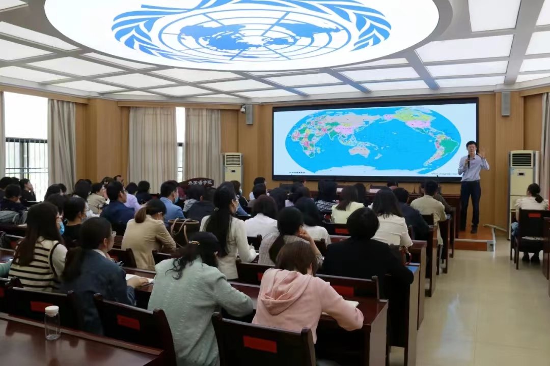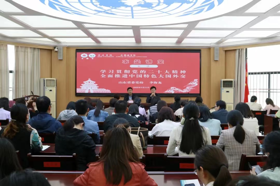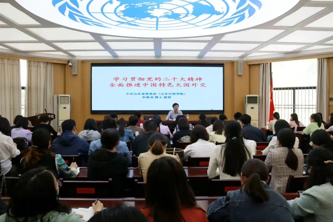 在全校上下开展学习贯彻习近平新时代中国特色社会主义思想主题教育之际,结合伟德国际victor1946主题教育工作方案,5月12日,伟德国际victor1946“求是讲堂”在7号教学楼102会议室开讲,山东省委党校教授、硕士生导师,山东一带一路研究中心研究员、省委组织部“名师送教”师资库专家成员李海龙教授应邀作题为《学习贯彻党的二十大精神 全面推进中国特色大国外交》的专题讲座。伟德国际victor1946全体教职工、马克思主义学院部分教师、伟德国际victor1946学生党员聆听本次讲座。活动由伟德国际victor1946党委书记尹晓允主持。