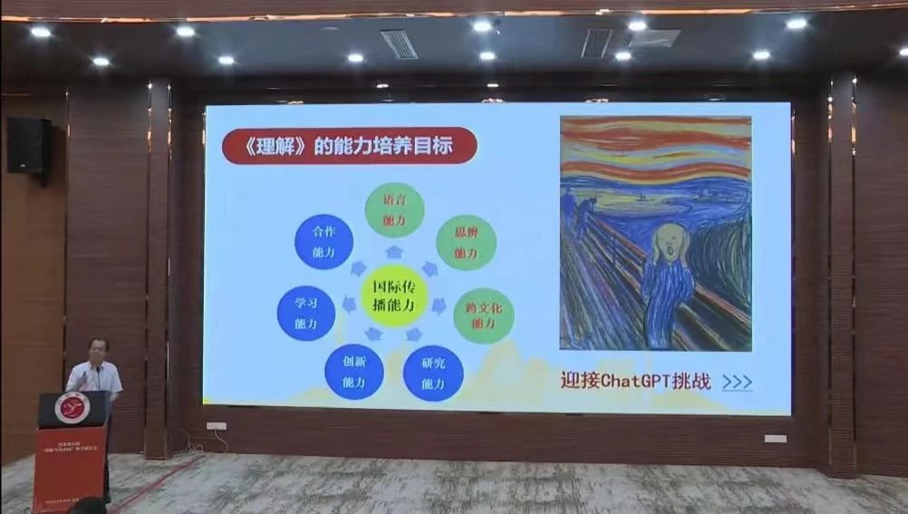 随后,教育部高等学校外国语言文学类专业教学指导委员会主任委员、《理解当代中国》系列教材编委会主任及英语系列教材总主编、北京外国语大学副校长孙有中教授就《理解当代中国》系列教材教学原则作了主旨报告。孙教授提出,在《理解当代中国》系列教材教学中,应寓价值塑造于知识传授和能力培养之中。他指出,各语种专业应根据办学定位和师资情况,将《理解当代中国》系列教材内容有机融入相关课程,或独立开设相关课程,或替换其他教材;任课教师要实现“三级跳”,理解语言、理解内容,理解当代中国,在教学中真正做到价值塑造、知识传授、能力培养“三位一体”。