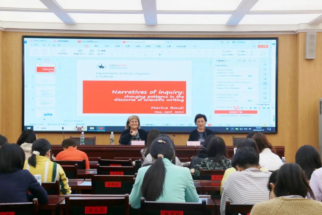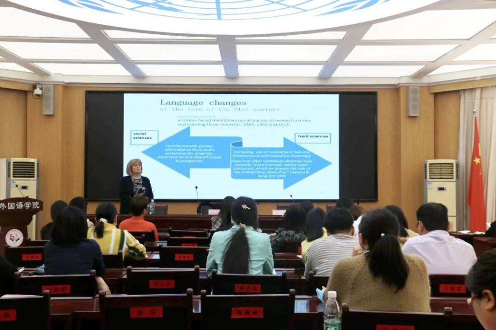 讲座伊始,李莉Marina Bondi教授表示热烈欢迎并重点介绍了其在英语语言学界的突出贡献Marina Bondi教授摩德纳大学博士课程负责人,Corpus and Language Variation In English Research创始主任,从事英语研究四十年期间Marina Bondi教授在体裁分析、EAP 和语料库语言学领域发表论文170篇,产生了广泛影响。她在研究过程中注重将话语分析和语料库语言学结合近期研究兴趣主要集中知识传播和数字媒体对专业话语的影响等方面