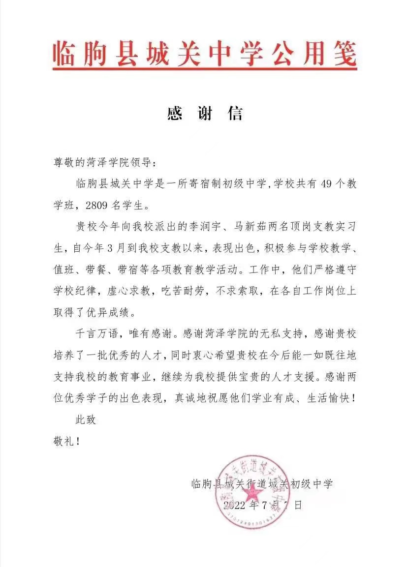 2022年3月,按照学校统一安排,我院2019级公费英语师范班马新茹、李润宇进入潍坊市临朐县临朐城关中学进行实习支教,受到实习单位的一致好评,并向我校来函表扬。临朐县城关中学在来函中对我院培养政治思想素质过硬、专业基本功扎实的学生表示肯定和感谢。