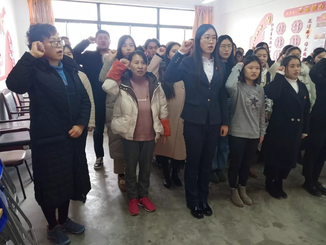 宣誓仪式正式开始。在学生党员杜清心的带领下,全体党员及预备党员进行宣誓。现场顿时响起了阵阵激昂的宣誓声,每位宣誓者都用发自内心的声音抒发对党忠诚的决心。宣誓过程庄严凝重,以此表达他们对党最真挚的感情。宣誓完毕后,刘静提出每位学生党员及预备党员要牢记自己作为党员的责任,加强党的知识学习,提高个人的党性修养,时刻提醒自己决定入党时的初心,做一名有理想有抱负的共产党员。随后,学生党员及预备党员对党员活动室文化墙进行学习观看。