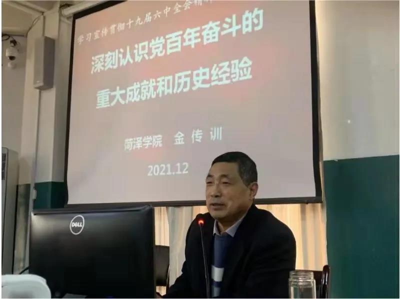 金传训结合图片、文字讲解,详细介绍了十九届六中全会会议内容。金传训的报告主要从以下四个方面展开:第一,要充分认识《决议》的重大意义。《决议》是一篇马克思主义的纲领性文献,是新时代中国共产党人牢记初心使命、坚持和发展中国特色社会主义的政治宣言,是以史为鉴、开创未来、实现中华民族伟大复兴的行动指南,必将对实现中华民族伟大复兴产生重大而深远的影响。第二,深刻认识党的百年奋斗的初心使命和重大成就。中国共产党百年历史划分为四个时期,每个时期都取得了瞩目的历史成就,具有深远的指导意义。第三,深刻领会和把握党百年奋斗的历史经验。党的经验是我们党在历经艰辛,饱经风雨的长期摸索中积累下来的,饱含着成败和得失,凝结着鲜血和汗水,凝结着智慧和勇毅。第四,从党的百年奋斗重大成就和历史经验中汲取智慧力量。要更加坚定、更加自觉地践行初心使命,在新时代更好坚持和发展中国特色社会主义。
