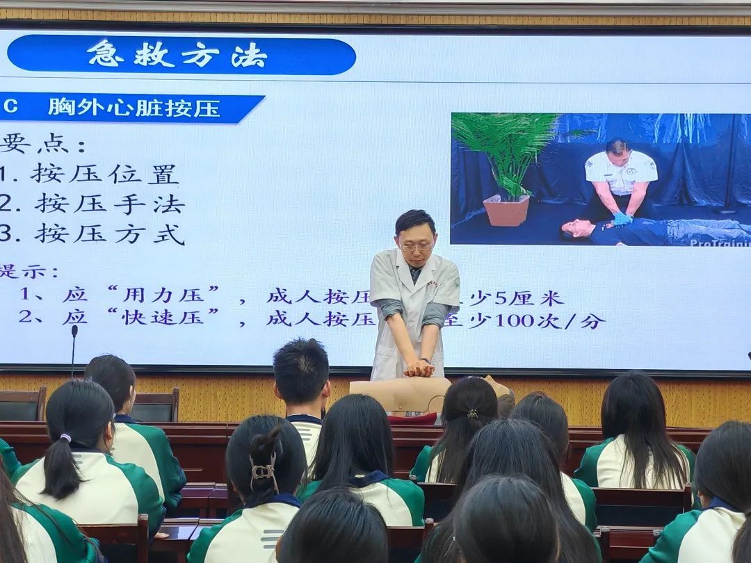 活动现场,王老师采用“理论+实操”双轨并行的教学模式,系统讲授急救知识与健康防护要点。在急救技能培训环节,王老师结合心肺复苏术的核心步骤,详细讲解胸外按压定位、气道开放手法及人工呼吸规范,着重强调“黄金4分钟”抢救窗口期的重要性。通过模拟人教具进行实操演示,指导学生精准把握按压深度、频率等技术参数。针对校园常见外伤,王老师现场演示擦伤清创消毒、无菌敷料包扎的标准流程,纠正日常处理误区。互动问答环节中,王老师通过典型案例剖析与问答交流,将专业知识转化为可操作的实践技能,有效提升学生应对突发健康问题的能力。