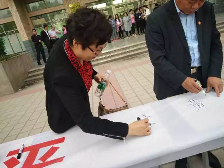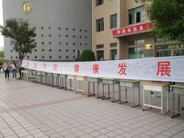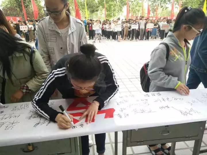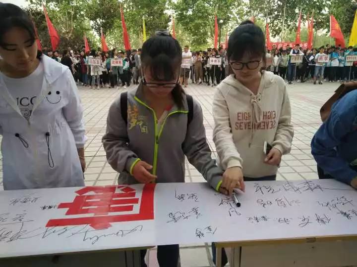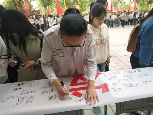 学生工作处处长王联奎上台讲话后,在学生代表的带领下我系学生举起右拳庄严宣誓“珍爱生命,珍爱他人 和谐身心……”,刘书记、徐导员及2016级学生六人代表我系在带有“理性平和,健康发展”的横幅上签字。活动现场,我系学生积极参与三人四足和两人跳绳的游戏。