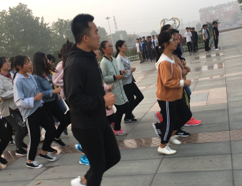 我院学生6点10分于7号教学楼门前集合完毕,由主席团对各班学生进行清点,了解请假、见习情况并向新生介绍早操注意事项。随后,各班班代及临时负责人负责领队,用响亮整齐的口号带领新生进行早操。期间,班代对新生的步伐频率、速度控制进行指导。学生会副主席徐冰说:“2018级新生的第一次早操还有不足很正常,需要大家坚持不懈地练习、调整。早操有利于身体健康、为一天的学习做准备。”