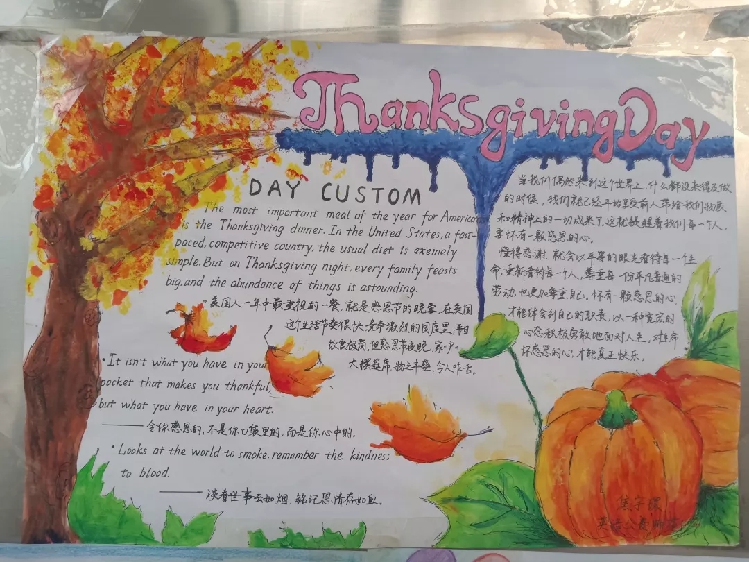 参赛者将搜集到的感恩节历史起源、节日习俗、特色饮食等方面的信息与优美的文字、精湛的画艺相结合,诠释自己对感恩节的认识。焦宇嬛凭借其独特的构图设计和丰富的色彩运用吸引了评委的目光,赢得了一致好评。王乐乐整洁的画面和整齐的书写也获得评委的认同。评委们本着公平、公正、公开的原则进行评选。最后,公费师范班的焦宇嬛荣获一等奖;航空二班的王乐乐、彭璇荣获二等奖;英语教育一班的房晓秋、孟佳玟及公费师范班的王佳欣荣获三等奖;商务英语游轮一班的朱绘如,商务英语班的刘正昊,跨境电商班的辛国秀,英语教育二班的李元杏、薛舒婷荣获优秀奖。