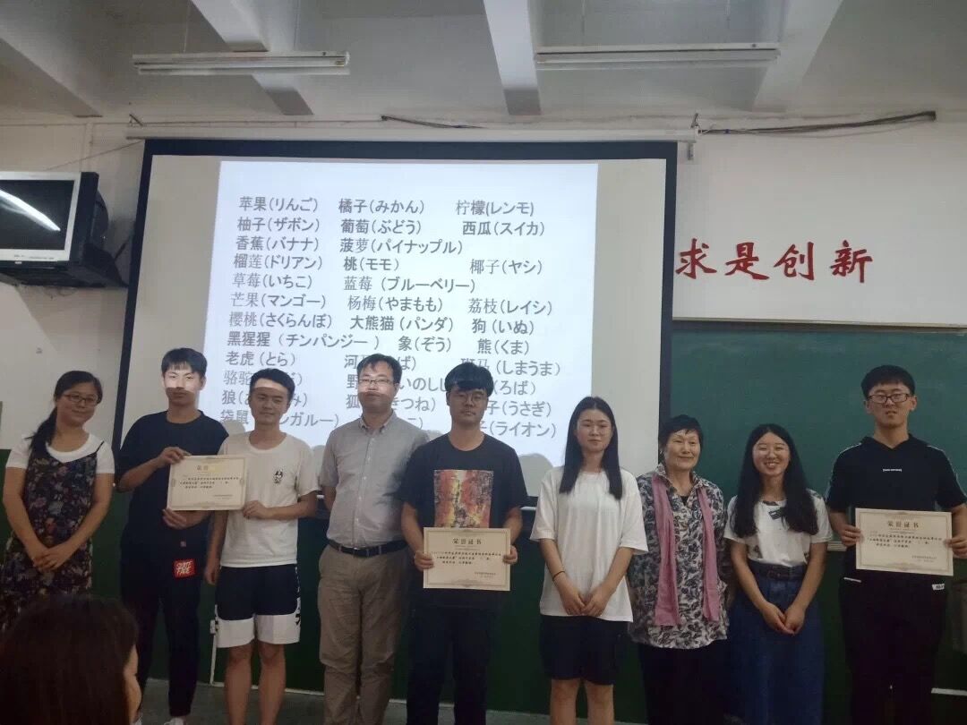 本次比赛分为选手配音、评委点评、游戏三个环节。董圣薇、王程程、薛梅婷第一组上台,演绎了经典动画《名侦探柯南》中的片段。其流利的对话、情绪饱满的语言让我们体会到了这部动漫中隐藏的爱恋的美好。接下来由卢力铭、葛福如带来的《我是大哥大》配音片段,其二人极大程度地还原了影视人物的语气、音调以及肢体动作,将日本80年代不良少年、少女之间让人忍俊不禁的故事展现的淋漓尽致,他们精彩的表演让现场观众笑声不断。中场休息环节,赵祖琛、卢力铭带来日文歌曲《灰色と青》,优美的歌声很好的调节了紧张的比赛氛围。由殷雪珂、赵祖琛 、张新禹演绎的《海贼王》配音片段,殷雪珂配音娜美,用哽咽的劝声完美地演绎了娜美保卫村子的决心。张新禹长达一分钟的大笑声形象地再现了鱼人阿龙滑稽的形象。赵祖琛配音路飞,其通过音节、语气、节奏点变化演绎出路飞保护心爱的娜美的决心,赢得了现场热烈的掌声。表演结束后,评委老师们对各组选手一一点评。最终,殷雪珂、赵祖琛 、张新禹荣获一等奖,董圣薇、王征、张新禹荣获二等奖,李莲莲、张萍、孙雪雪、聂盟盟、荻晓丽等人荣获三等奖,葛福茹、卢力铭荣获趣味奖,赵祖琛、殷雪珂分别荣获最佳男、女配奖。