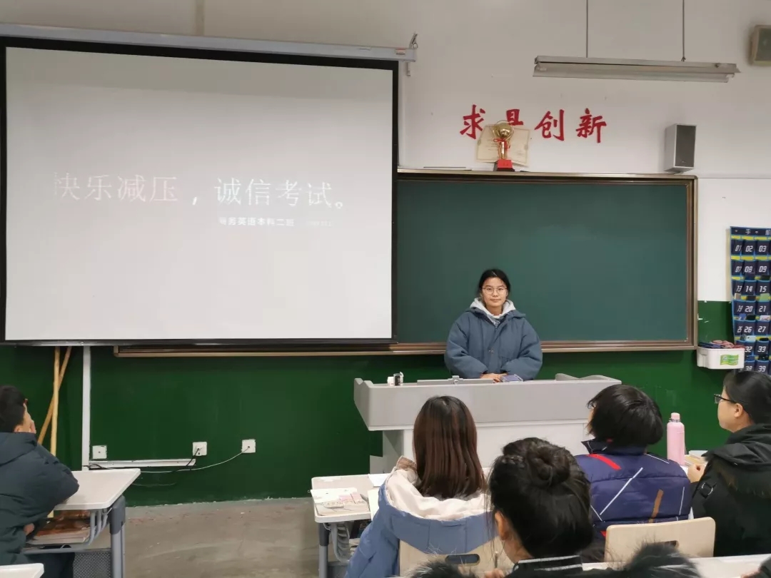 随着期末考试的临近,为了营造良好的考试氛围、净化考场环境、杜绝有失诚信的舞弊行为。12月19日,由伟德国际victor1946团委主办,学生会心理健康部承办的以“快乐减压,诚信考试”为主题的班会于伟德国际victor19462019级各班教室举行。
