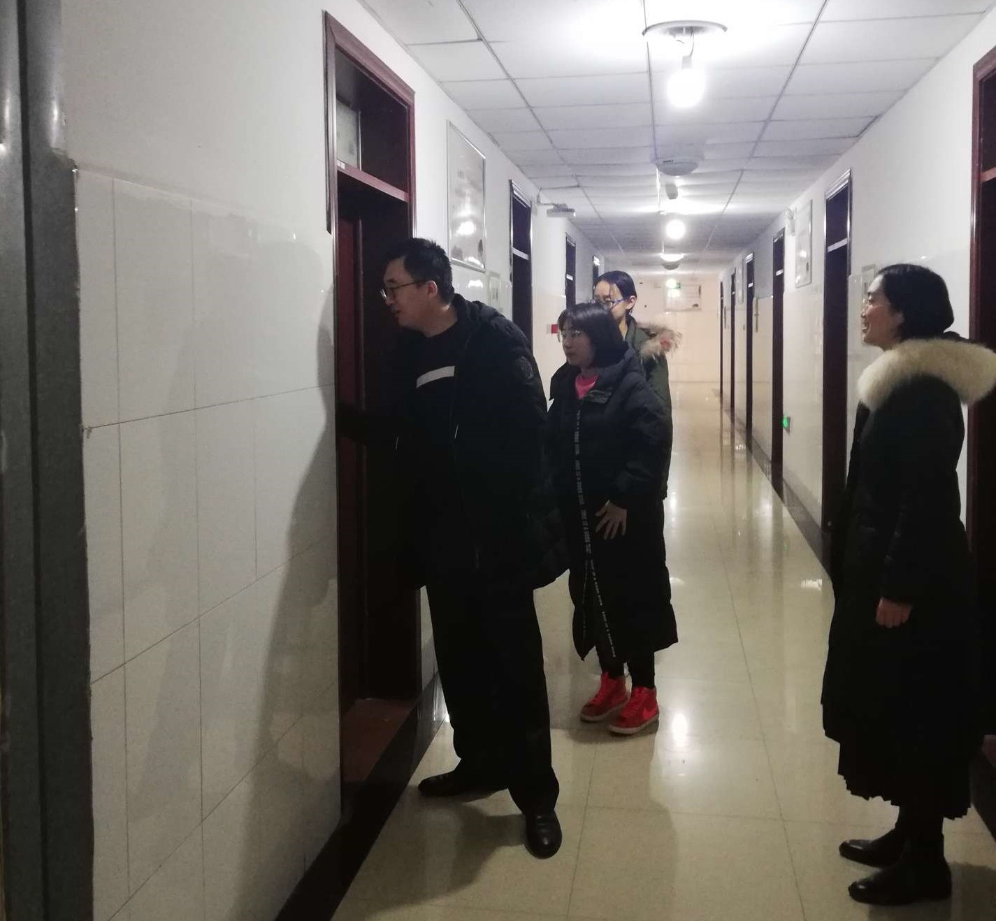1月10日下午,我院党委副书记杨冬,团委书记张丽竞,党政办公室主任郝海玲,辅导员王丽芹、曹展展、陈蕾、刘亭亭、带领学院学生干部,在学生寒假来临之际,深入教室、宿舍开展走访活动,重点对教室整洁问题以及宿舍安全隐患问题进行排查。
