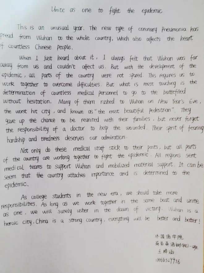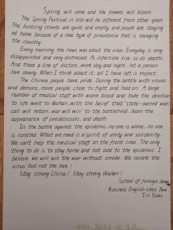 本次活动旨在使学生们时时跟进疫情进展,明确自己所肩负的责任,齐心协力,为打赢疫情防控阻击战贡献一份绵薄之力。评选结束后,英语俱乐部负责人姜旭东对此次征文内容的高质量、写作的高水平进行了表扬,并希望大家能以此次活动为契机,继续为武汉加油,为中国加油,为世界加油。