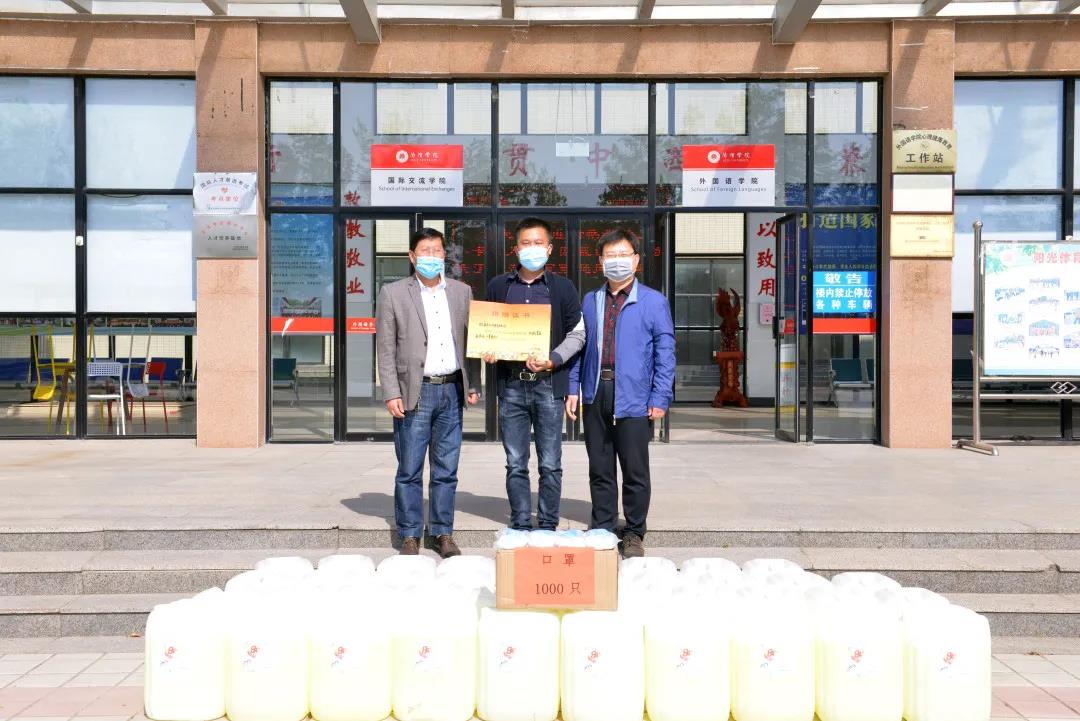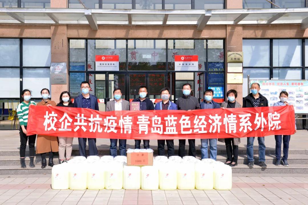 校企共抗疫情,青岛蓝色经济情系外院。4月23日,青岛蓝色经济有限公司向伟德国际victor1946捐赠了1000个口罩、一吨消毒液防疫物资,为学院开学准备、守护师生安全提供了有力支持。