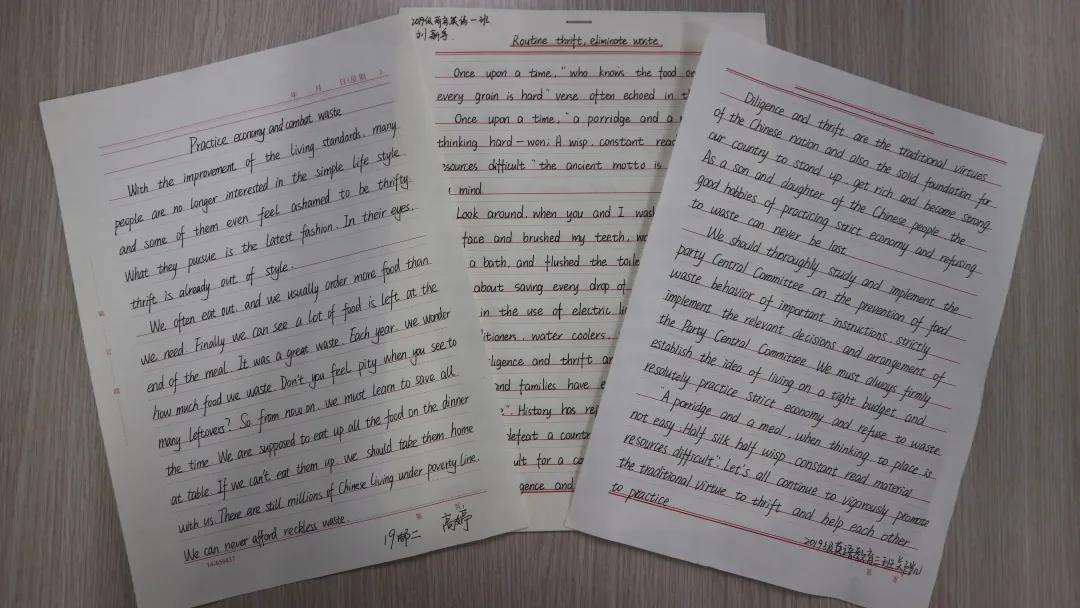 活动前期,参赛者充分利用课余时间搜集相关资料,并与自己的想法与观点相结合,以更好的通过文章诠释对“厉行节约,反对浪费”的认识。其中,2019级商务英语一班宋庆伟引用马歇尔说的话“There are no passengers on Earth, we are all crew”,从而引出下文,“The better tomorrow is in our hands ”。文章承上启下、结构严谨,获得评委们一致好评。2019级商务英语邮轮二班王琳以“Advocate economy and oppose waste”为中心进行阐述,同时凭借其整洁的卷面和工整的字体在评选中脱颖而出。2019级公费英语师范班孙雪艺在文章中号召大家“To practice strict economy and combat waste”,提倡大家养成良好的节约行为。文章内容充实、字体工整,赢得评委们的青睐。评委的评委们本着公平、公正、公开的原则,从内容、书面整洁、字迹工整等方面进行综合评比。最终,来自2019级商务英语一班宋庆伟获得一等奖;2019级商务英语邮轮二班王琳、2019级公费英语师范孙雪艺获得二等奖;2019级商务英语一班刘新宇、2019级商务英语邮轮二班高婷、2019级英语教育三班郑凯获得三等奖。