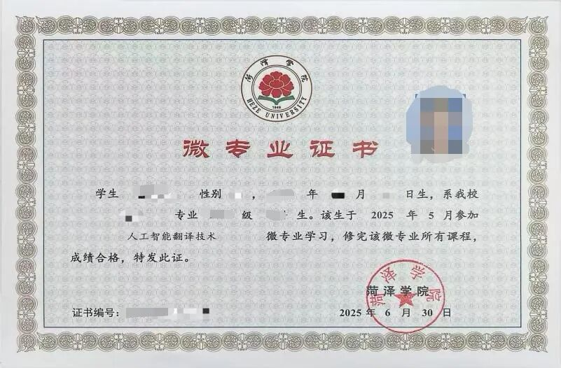 五、证书授予学生完成本微专业全部课程学习并通过考核,达到15学分要求后,由伟德victor1946颁发“人工智能翻译技术”微专业证书,证书信息纳入学校学籍管理系统,学信网可查询,作为学生跨领域就业、升学的重要能力证明。