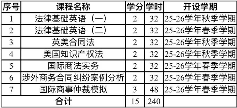 本专业以培育法商领域复合型人才为核心目标,致力于让学生精准理解英文语境下的法律基本概念与基础知识,系统掌握英美国家合同法和知识产权法的核心理论及法制体系,深度熟悉其商务法律体系全貌,同时锤炼以法律思维分析、解决法商领域实际问题的能力,为投身涉外法律和国际商务等相关工作筑牢专业根基。