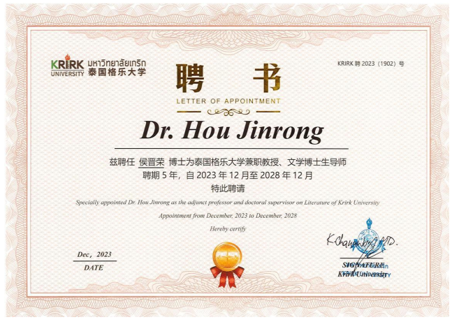 近日,伟德国际victor1946侯晋荣老师被聘任为泰国格乐大学兼职教授,文学博士生导师。至此,我院博士生导师达到 2 人,硕士生导师 5 人,研究生培养团队力量得到进一步加强。近年来,伟德国际victor1946以“家国情怀,国际视野”为院训,注重师资队伍建设和高质量发展,提升科研水平和团队建设,积累人才培养经验,推进学科内涵建设,服务经济社会发展和“一带一路”等国家战略。