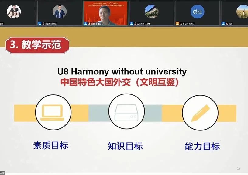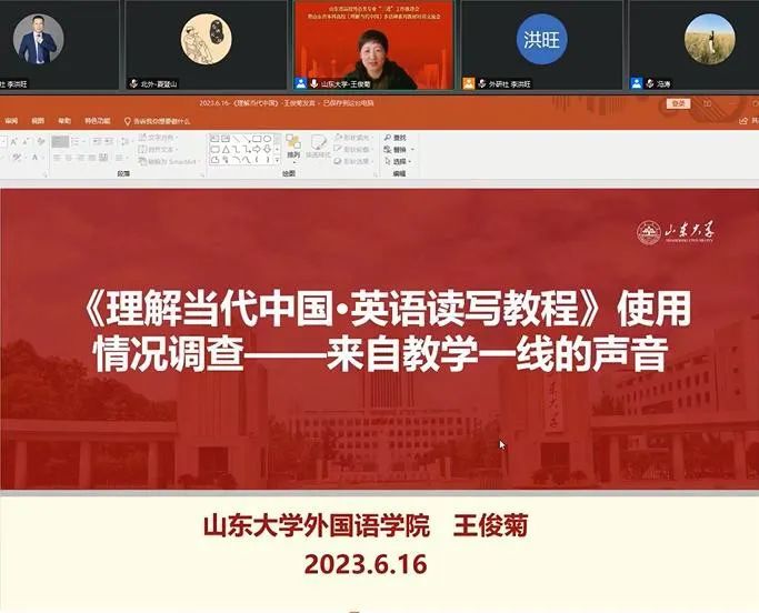 随后,会议进入《理解当代中国》系列教材教学实践分享环节。首先,北京外国语大学夏登山教授以《理解当代中国:英语读写教程》第八单元(Harmony Without Uniformity)为例进行了教学示范。根据章节教学目标,他将整个教学过程分为八步,即导语(提问)⇢ 课前预习(写作)⇢ 课文理解(讨论)⇢ 思辨阅读(开放性问题辩论)⇢ 全球视角(写作)⇢讲好中国故事(写作+小组汇报)⇢ 语言练习(翻译)⇢ 中国智慧(阐述格言警句);其次,山东大学伟德国际victor1946院长王俊菊教授通过调研数据展示了山东大学对《理解当代中国:英语读写教程》的使用情况,她指出教材在试用过程中虽然存在教学内容多、课时分配压力大、理解困难、解读空间小和趣味性有限等问题,但是从总体推进情况来看,进展顺利、好于预期、师生受益、前景可期;随后,山东师范大学伟德国际victor1946院长王卓教授以指向中国特色的 “全球素养”为关键词介绍了《理解当代中国》系列课程设置和教学实践相关经验。王卓指出,山东师范大学伟德国际victor1946在新一轮培养方案修订中,确定了以培养兼具本土性和全球性的“全球素养”为课程体系建构的目标指向,并建构了从“理解中国”到“讲好中国”,从 “看懂世界”到“讲好世界”为课程文化价值取向,以学科知识和跨学科知识融合、学科专业课程和教师教育课程有机衔接的课程体系;最后青岛大学伟德国际victor1946院长卞建华教授介绍了青岛大学伟德国际victor1946在《理解当代中国》汉英翻译/英语演讲课程中的教学探索与实践。卞建华强调,在“大思政教育”背景下,在不同语种的专业教育中全面融入《理解当代中国》系列教材内容,有助于实现教师素养提升、教书育人、立德树人与学生自我学习、自我教育和自我成长的良性互动。