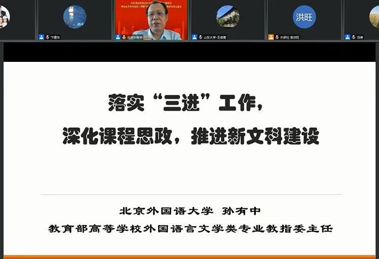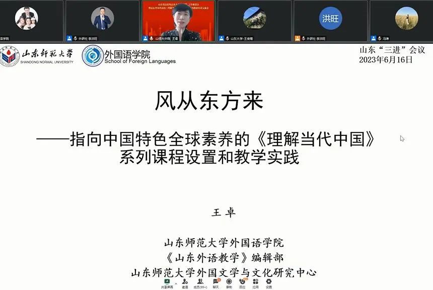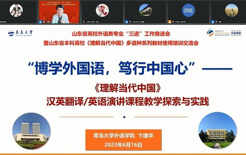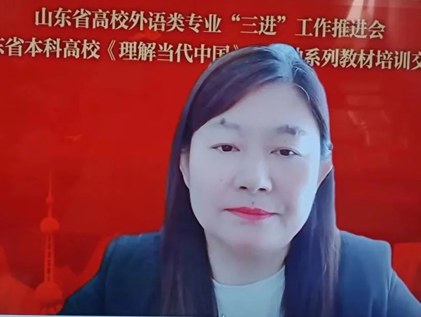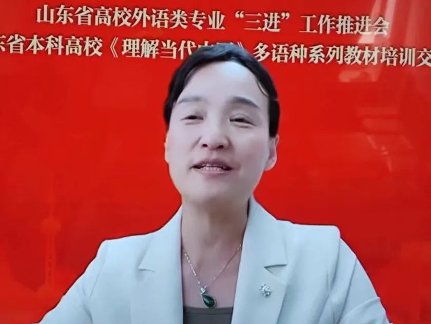 6 月 16 日,山东省高校外语类专业“三进”工作推进会暨山东省本科高校《理解当代中国》多语种系列教材培训交流会在线召开,伟德国际victor1946党委书记尹晓允、学院副院长李莉、英语系主任刘静、日语系主任楚焕焕、《理解当代中国》系列教材相关课程负责人以及学院骨干教师共同参加了此次会议。