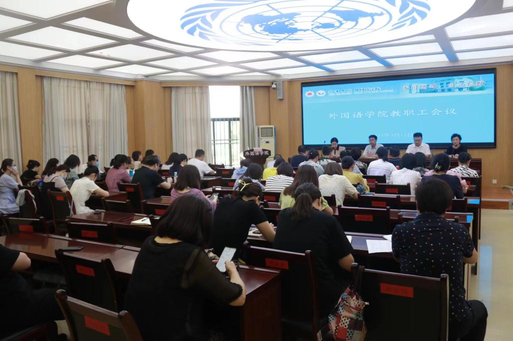 会上,孙洪波首先传达了学校暑期工作安排部署会议精神,从政治引领、内涵建设、社会服务与应用型建设、团学工作、特色工作等方面对上半年学院工作进行了总结。他从暑期值班制度、主题教育、教学任务、师资培养、招生宣传、家访工作及暑期“三下乡”等七个方面对暑期工作进行详细安排。对于下半年工作,从党建标杆院系建设、意识形态安全、教育教学、学科专业建设、师资队伍建设和人才引育、科研能力和社会服务、学生教育管理服务、协同育人等八个方面进行安排部署。他要求全体教师高度重视伟德国际victor1946师范认证及专业建设工作,做好产业学院建设和人才引进工作,鼓励师生参加各类外语赛事,提升国际传播与人文交流的能力,加强新文科背景下国别与区域研究,积极响应国家级一流本科课程建设的要求,不断提升课程建设水平和人才培养质量。