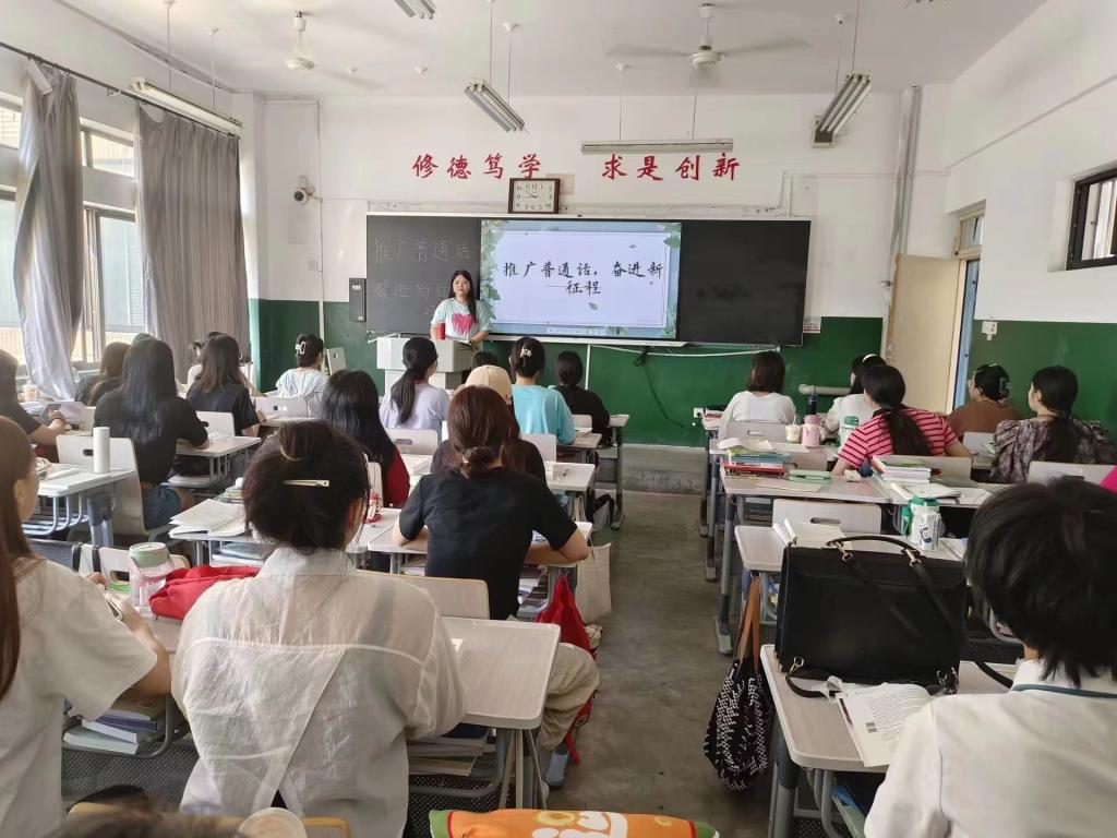 班会上,各班班主任首先向大家阐述了《国家通用语言文字法》和《国务院关于推广普通话的指示》等国家语言文字的方针、政策及法律法规,让学生对推广普通话有了初步了解;随后,班主任结合学生学习生活实际,提醒学生们要养成“说好普通话、写好规范字”的良好习惯,让学生真切感受到说好普通话和推广普通话的重大意义,引导学生做普通话和规范字的使用者、示范者和宣传者。