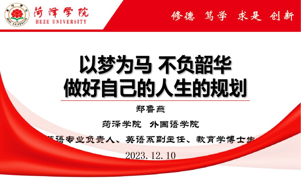 2023年12月10日,伟德国际victor1946英语专业负责人、英语系副主任、教育学博士生郑鲁燕老师莅临定陶区第一中学,为高二学生实验团队做了一场精彩的人生规划主题讲座。郑鲁燕的讲座主题为“以梦为马 不负韶华 做好自己的人生规划”。本次讲座由定陶一中级部主任谭荷英主持。