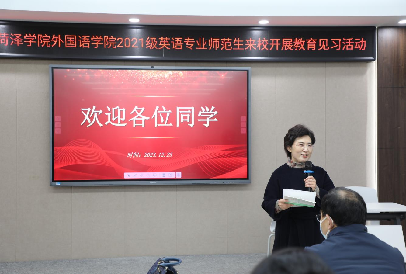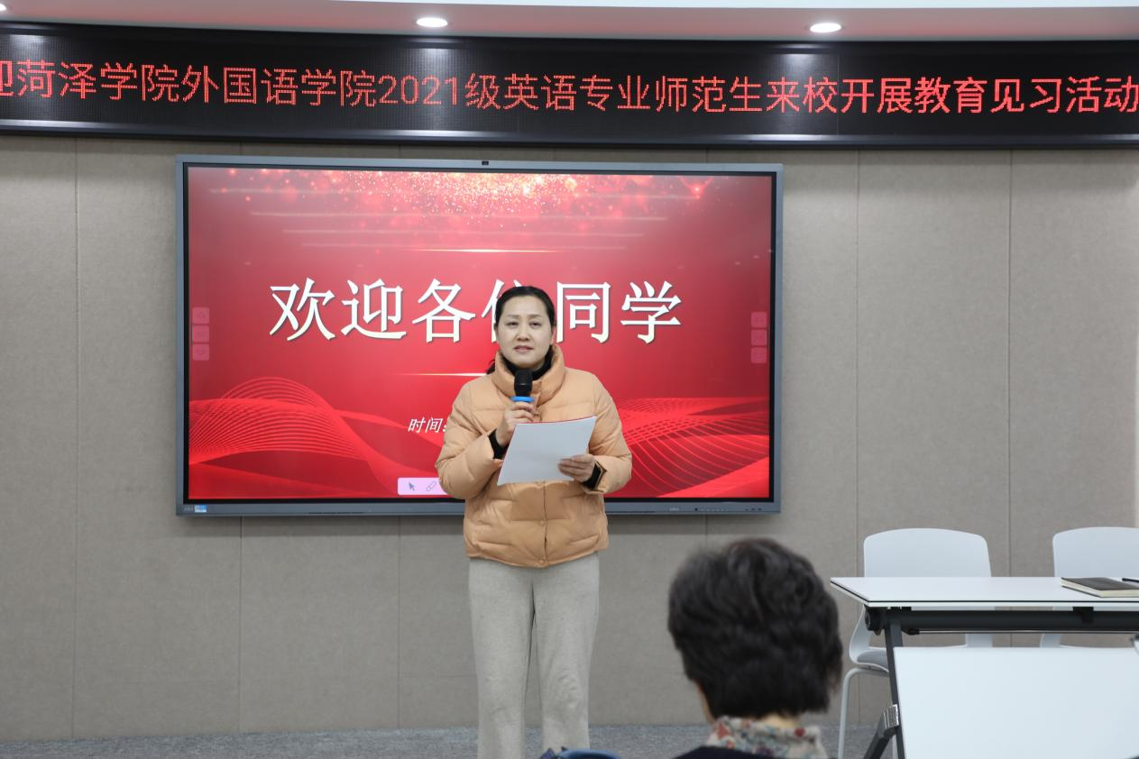 李莉对牡丹区二十二初级中学为师范生提供的教育见习机会表示诚挚的感谢。她表示,牡丹区二十二中师资力量雄厚,办学成果丰硕,教育理念先进,教学质量高,社会声誉好,升学率和素质教育更是有口皆碑。希望见习生们加倍珍惜这难得的机会,多听多记,多思多想,学做人、学教学、学育人、学发展,努力深化专业理解,提升专业技能,在实践中体验教育的魅力和责任,迈好教育之旅的第一步。同时她要求学生一定要严格遵守见习学校规章制度,用一位老师的标准严格要求自己,一切听从见习学校和见习指导老师的安排。