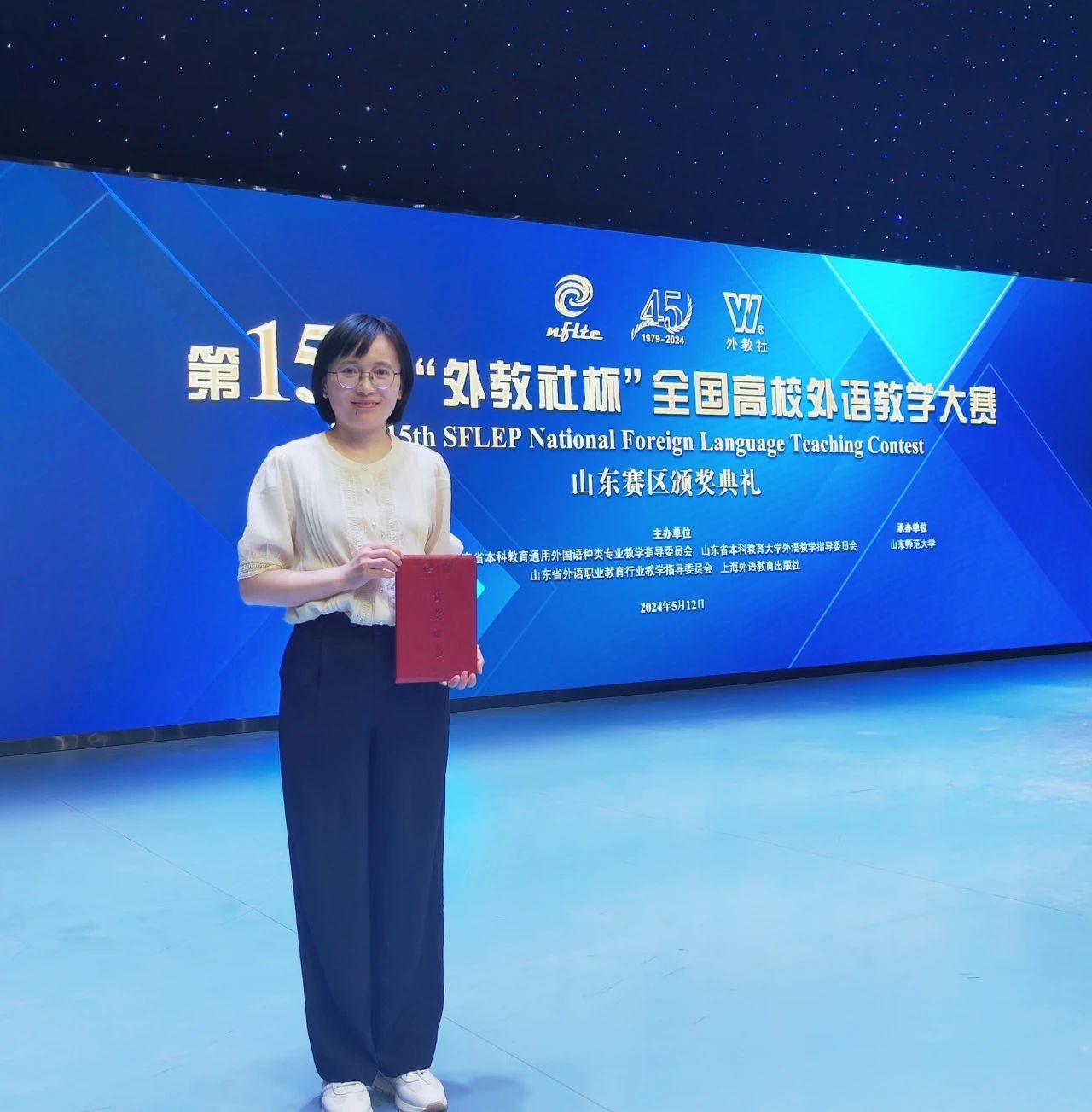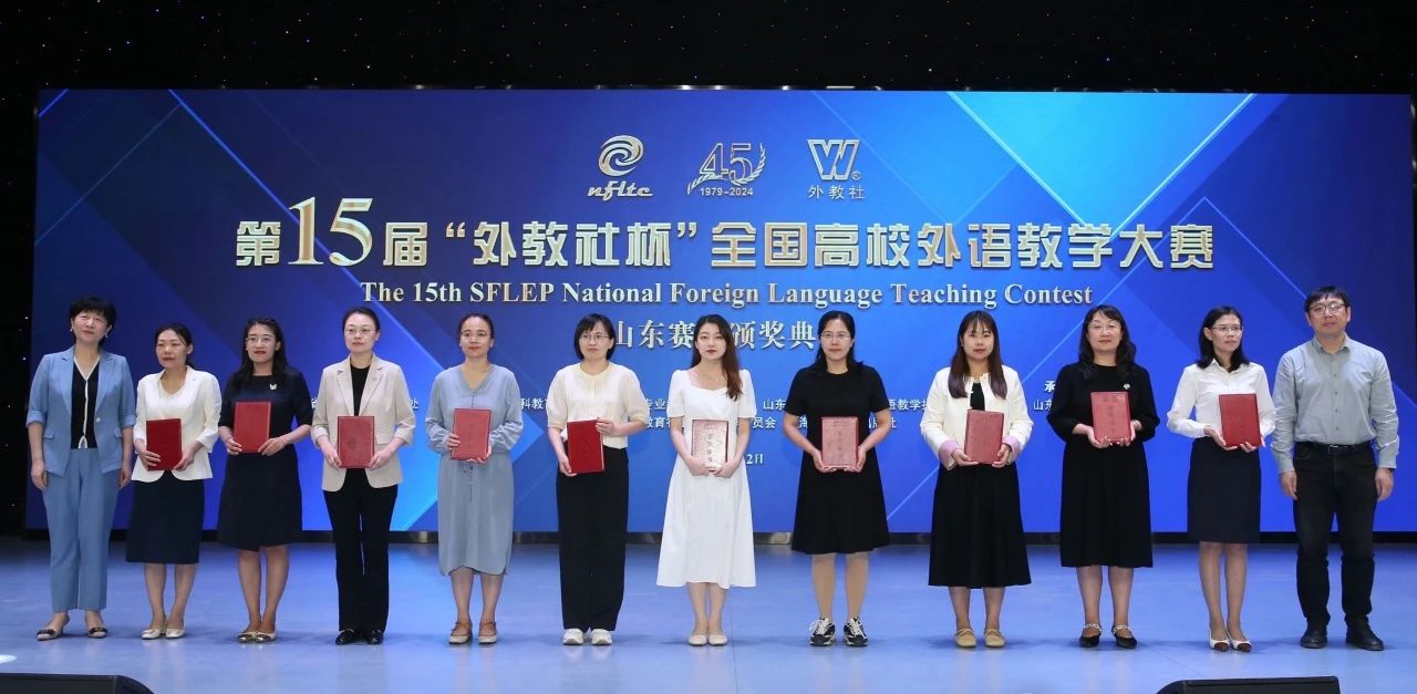 2024年5月12日,第十五届“外教社杯”全国高校外语教学大赛山东赛区复决赛在山东师范大学(长清湖校区)落幕。本届比赛分为本科英语专业组、本科大学英语组、高职公共英语组三个组别。省内高校的162个团队报名参赛,其中本科英语专业组43个团队。我院英语专业教师团队(主讲教师:张静静;课程指导:李莉教授;团队成员:刘静、宋慧岩)比赛成绩位列第12名,荣获三等奖。