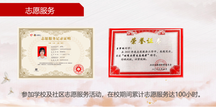我认为,知识不仅仅是书本上的文字,更是实践中的智慧。大学时光里,我曾担任伟德国际victor1946宣传部副部长,心连心助学联盟社团网编部部长,被评为“优秀干事”和“优秀部长”,现任外院党站部长。在上学期的实习工作中,从聆听指导老师对我们的教诲,到向有经验的老师学习,到自己备课、集体备课,再到自己站上讲台讲课,这个过程是需要用心修炼的过程。同时,在陪伴学生完成作业、参加各种文体活动中,我也寻找到成为一名教师的快乐,也更加坚定了我成为一名优秀教师的信心和决心。在课余时间,我积极参与各类志愿活动,在校期间累计志愿达100小时,获得“优秀大学生志愿者”称号,今后,我会在实践中不断提升自我,促进自己的全面发展。