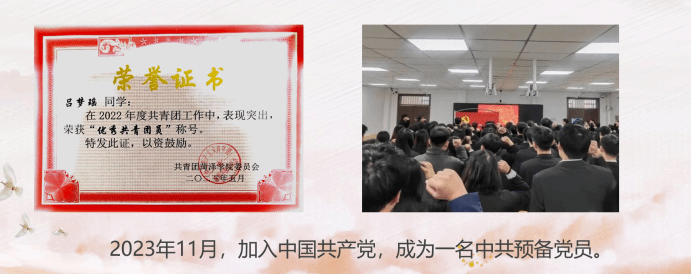 作为青年学生,要坚定理想信念。对于我而言,成为一名中国共产党员,是我对理想信念的最高追求。我在入学之初就主动递交了入党申请书,我积极参加各项党团活动,努力学习习近平新时代中国特色社会主义思想,以一名党员的标准要求自己,被评为优秀共青团员202311月,我光荣的加入了中国共产党,成为了一名中共预备党员。党员身份不仅是一种荣誉,更是一种责任,它激励我在任何时候都要发挥先锋模范作用,为同学服务。
