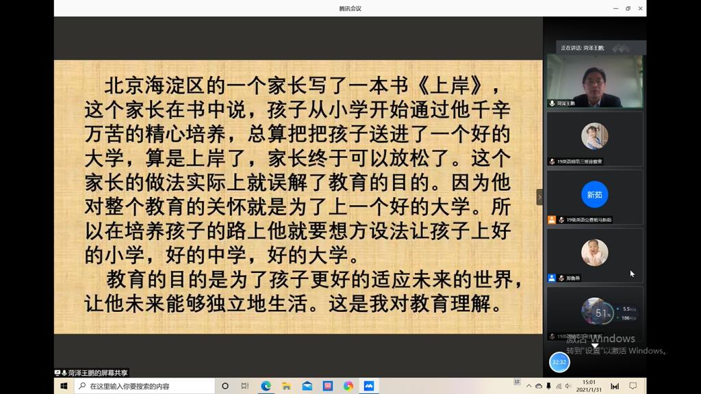王鹏老师结合自己二十七年坚守农村教学的经历,从教育的内涵及目的、新时代教师专业能力发展,及教师道德情操的重要性等几个方面对“师德”进行解读。同时,他以教育的时代发展为背景,强调了教育创新的重要意义。